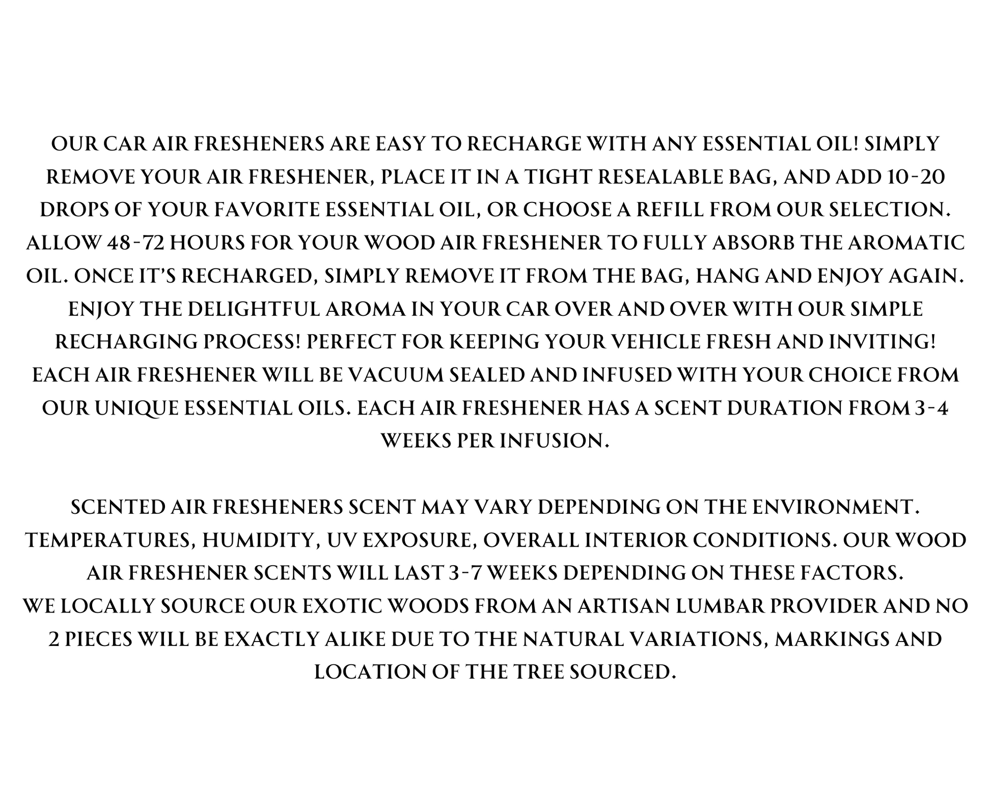 Transform your car with our reusable handcrafted Wood Car Air Fresheners, infused with your choice of essential oils! Choose from a wide variety of design options to suit your style, or feel free to make custom requests for a unique touch. Each air freshener not only adds a delightful aroma but also enhances your car’s decor. Perfect for personal use or as thoughtful gifts. Enjoy a fresh and inviting driving experience while showcasing your personality. Our exotic wood air fresheners provide a long-lasting scent while reducing waste compared to single use disposable air fresheners.