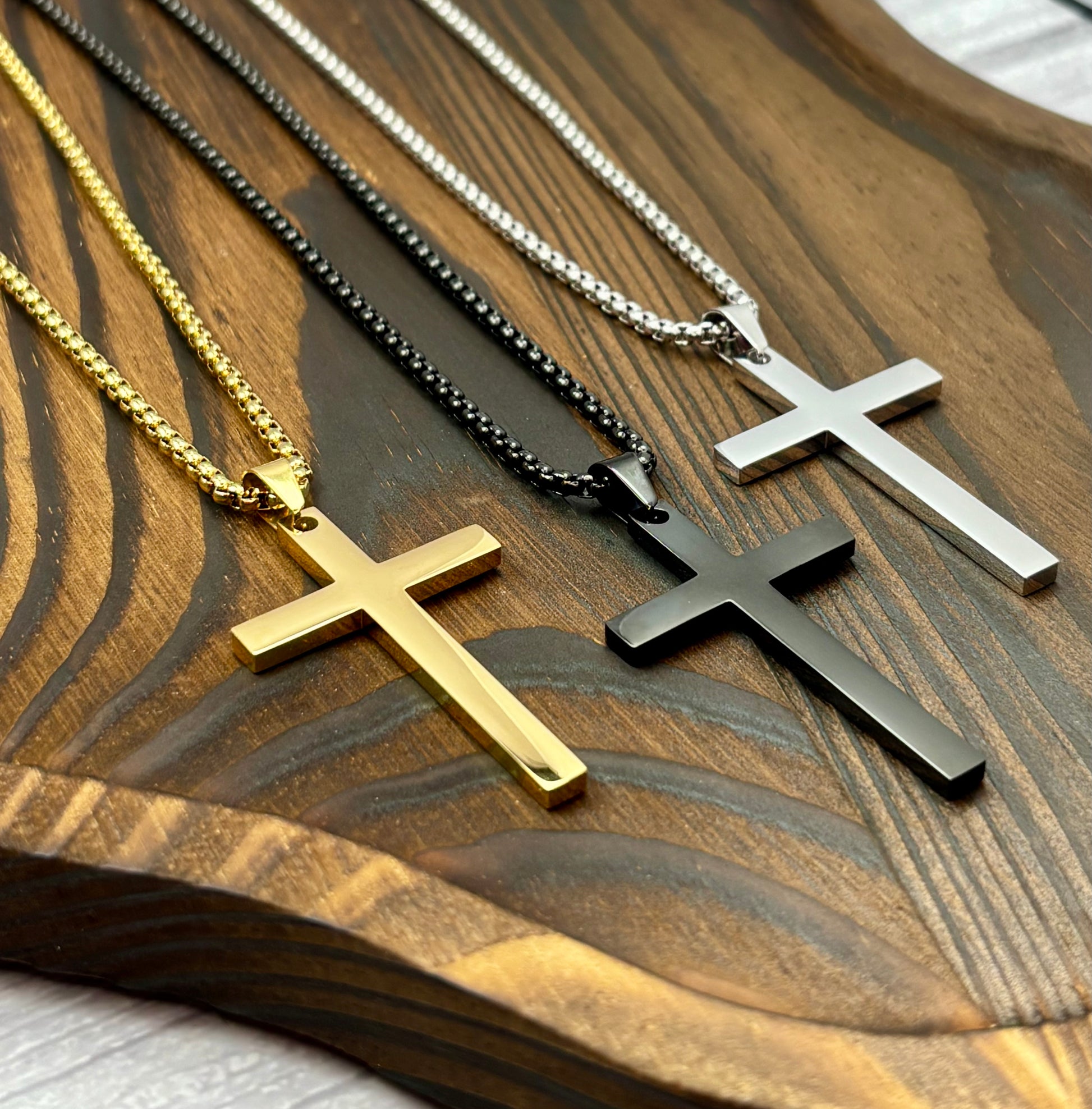 This substantial vertical cross pendant measures approximately 2 inches in length, suspended from a 24-inch chain secured with a reliable lobster clasp. Engineered with tarnish-resistant materials that maintain their appearance over time, the necklace resists fading while remaining hypoallergenic for most wearers—an ideal choice for those with sensitive skin. A thoughtfully constructed piece designed for everyday wear and lasting durability.