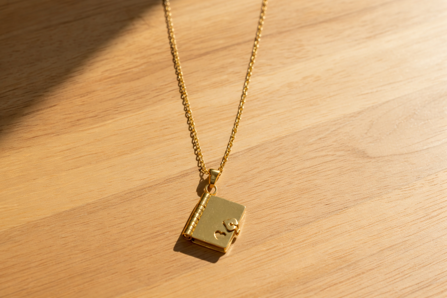 Express your unique narrative through this sophisticated story book pendant and customize each page. Featuring a functional miniature book with three engravable turning pages and a charming heart-shaped cutout on its cover, this piece captures imagination in wearable form.